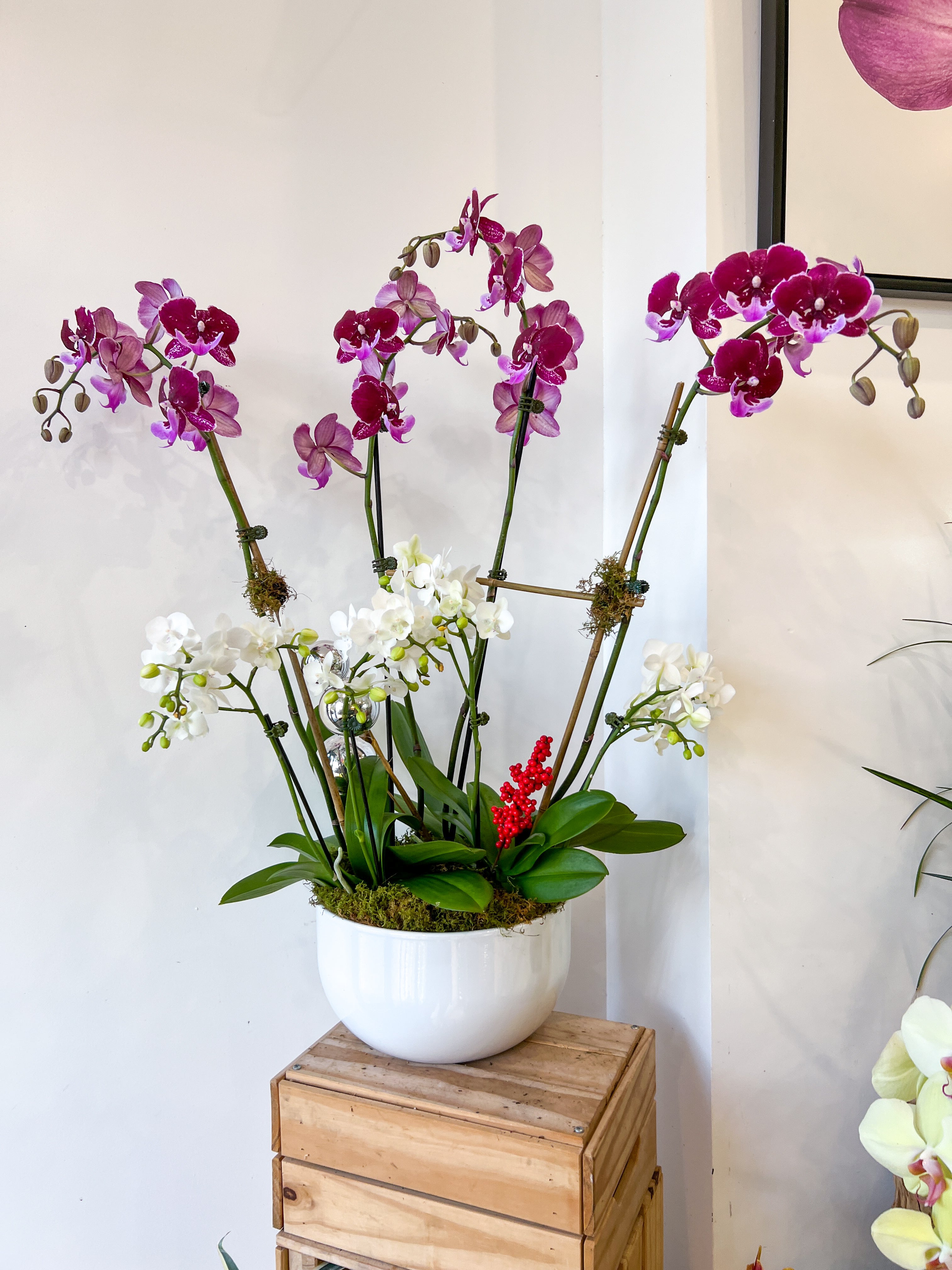 Our award winning orchids staged with golden decor, preserved moss and stones. Perfect gift to elevate your holidays. The bowl can be reused for floral arrangements or fruit, or stands just as beautifully alone as an accent piece.
