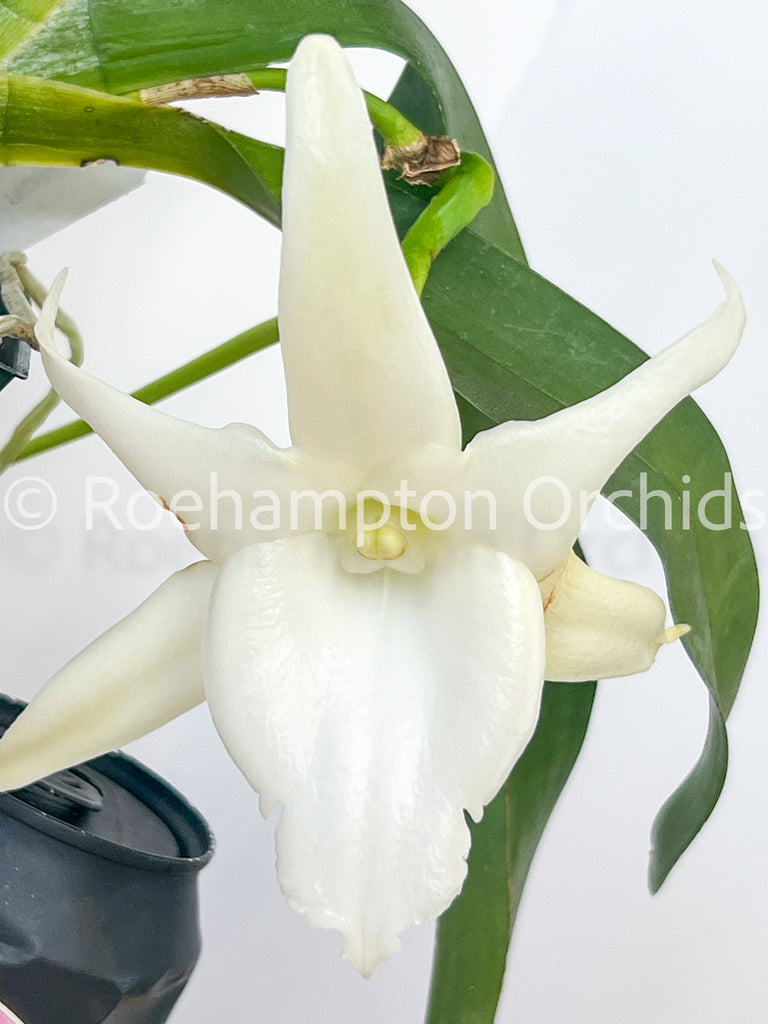 With stunning porcelain white blooms and beautiful scimitar shaped flowers, combined with ease of care this is a must have for any collection. This is a great starter plant to get into other varieties of orchids as it can tolerate many different conditions.